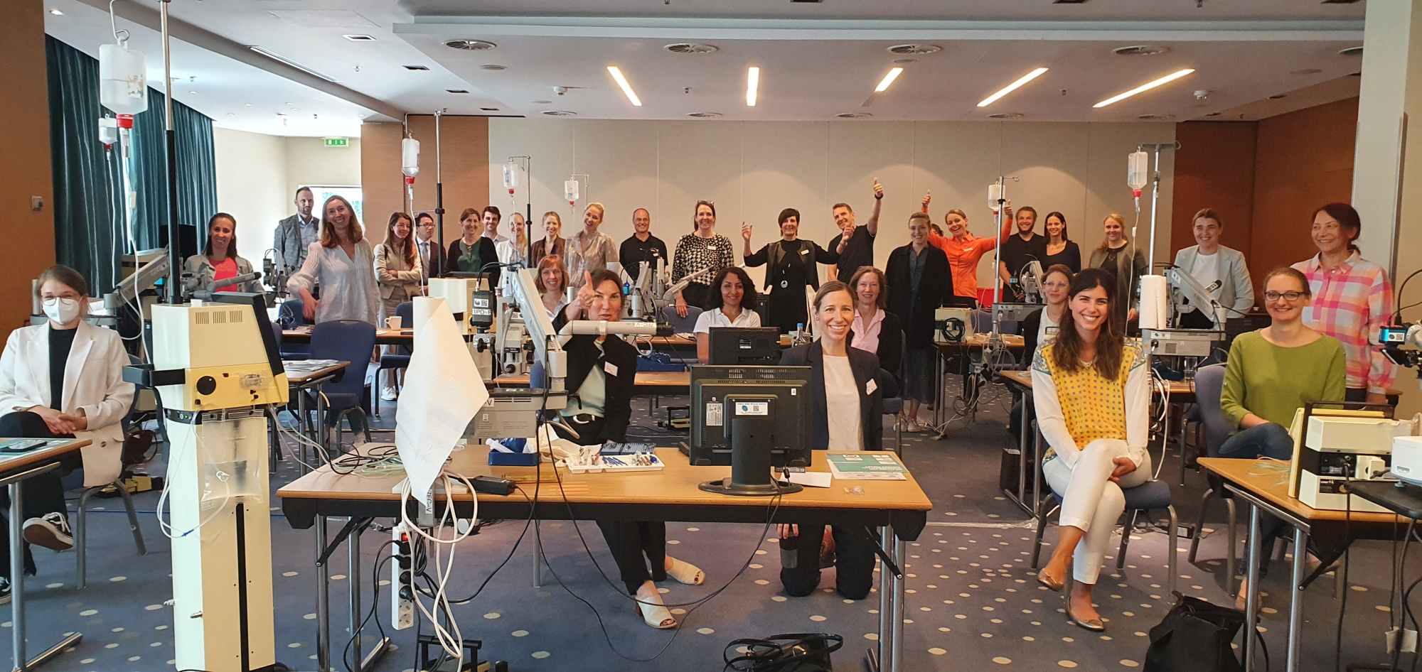 Seit fünf Jahren nun hat sich das Konzept der zwei parallel stattfindenden Kurse bewährt, an welchen auch dieses Jahr wieder je 10 (angehende) Augenärztinnen teilgenommen haben. In einem steten Wechsel zwischen Praxis und Theorie konnten die Teilnehmerinnen in den zwei Tagen viel neues Wissen und Praxiserfahrung mitnehmen. Die drei Referentinnen Prof. Dr. med. Anja Liekfeld (Potsdam), Dr. med. Catharina Latz (Bonn) und Dr. med. Nicola Vandemeulebroecke (Düsseldorf) stellten ihre Expertisen den Teilnehmerinnen theoretisch und praktisch mit hohem Engagement zur Verfügung. Die intensive Betreuung und hervorragende Ausstattung wurde durch die großzügige Unterstützung von KOWA Pharmaceutical Europe Co. Ltd. und die Oertli Instrumente AG möglich.