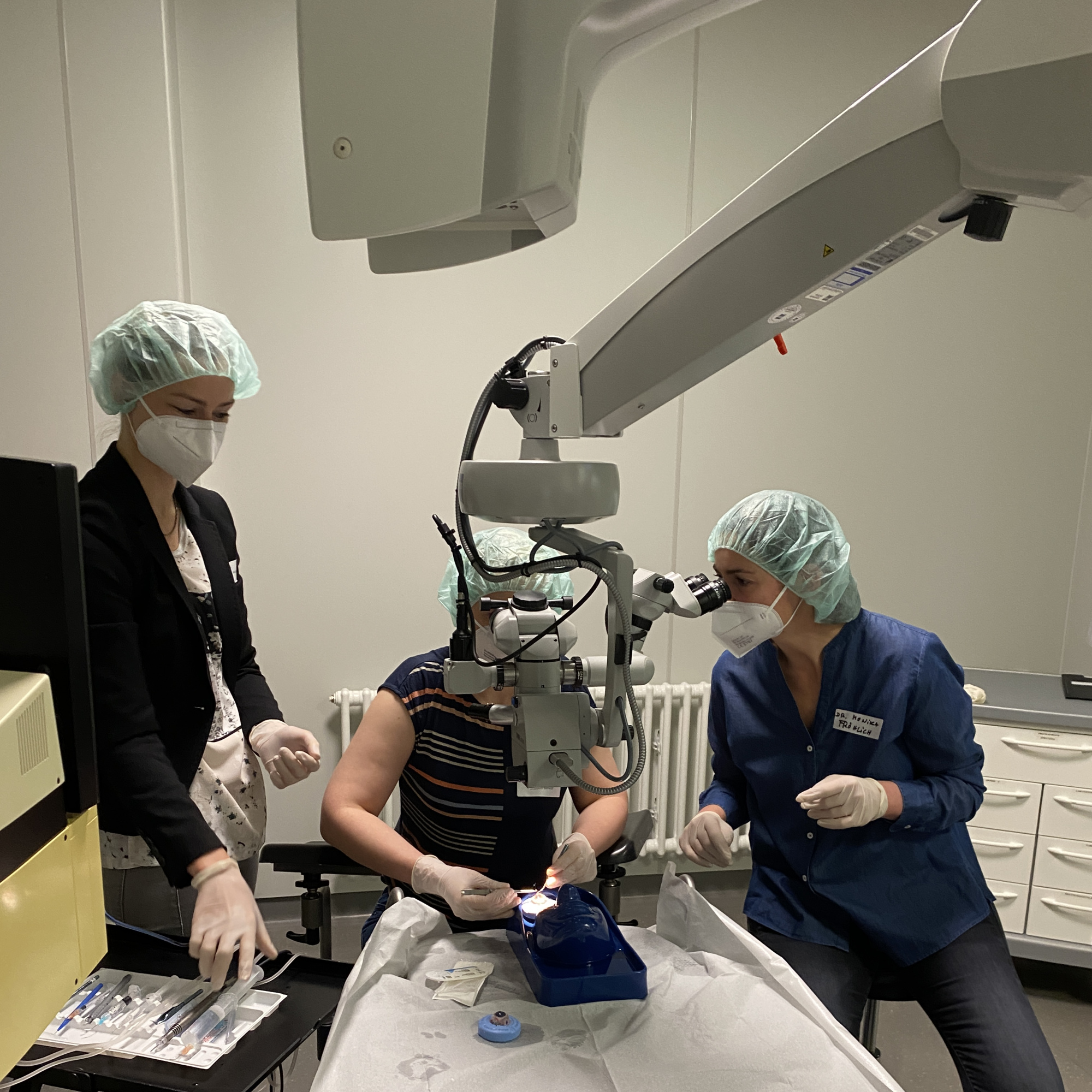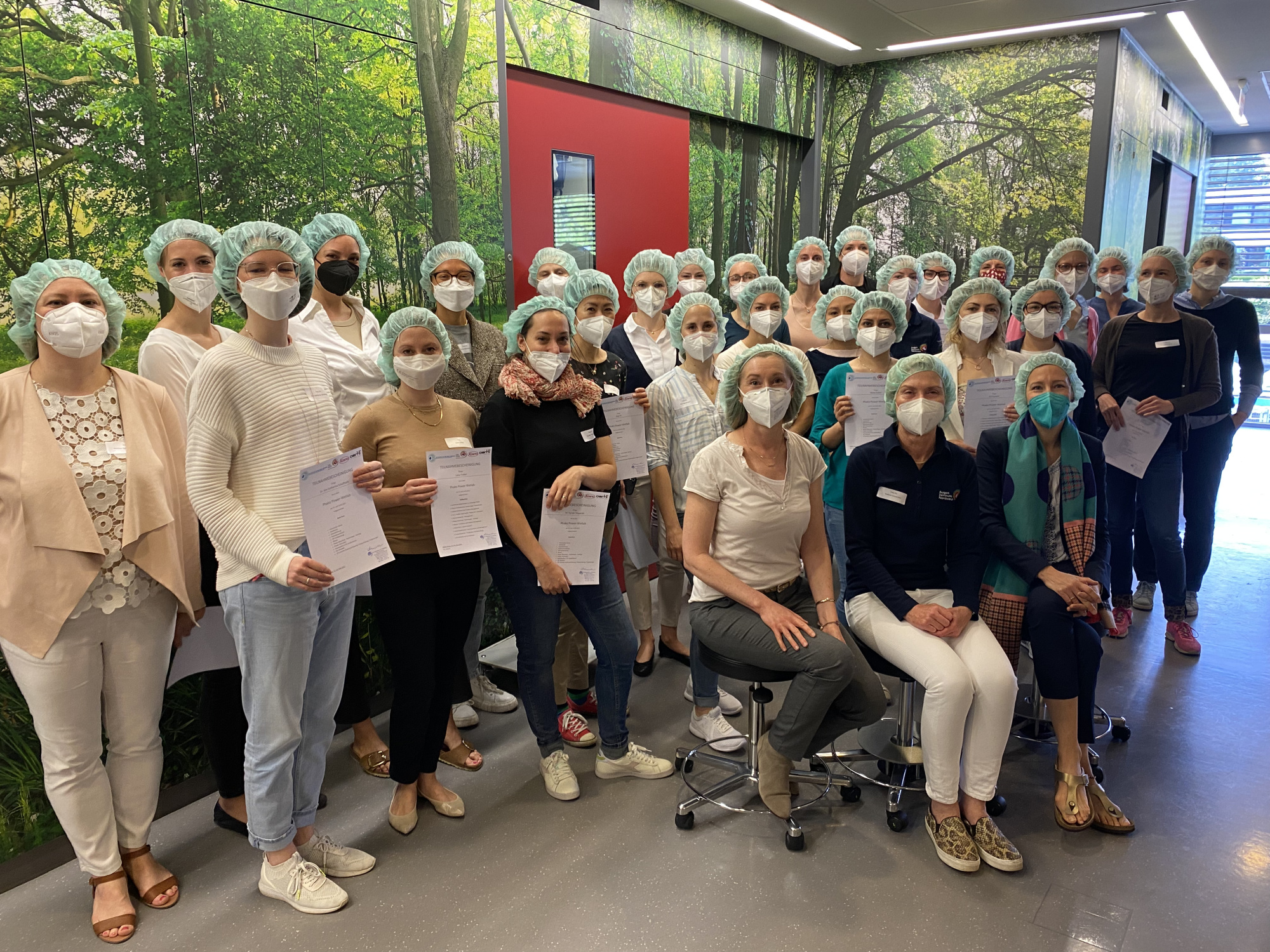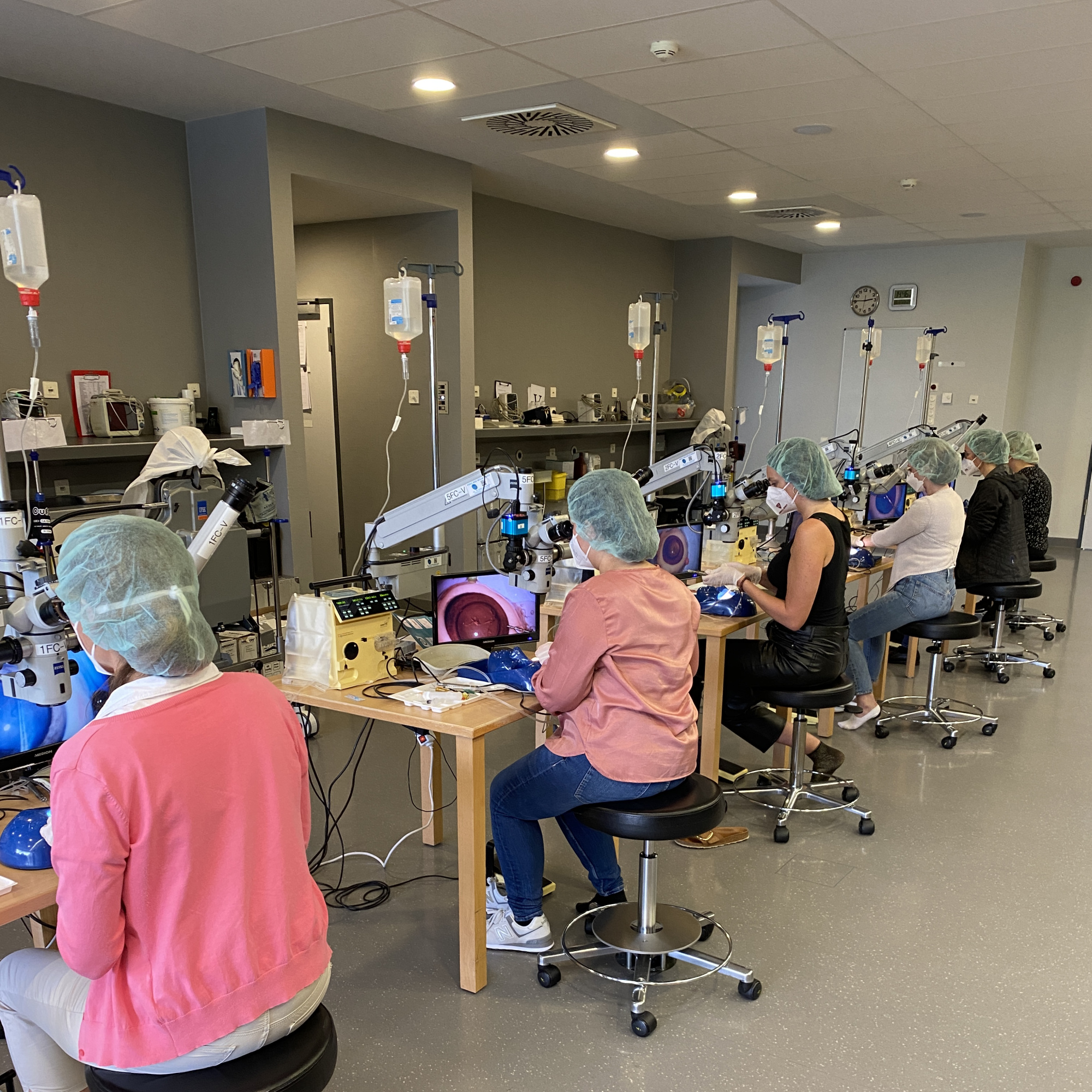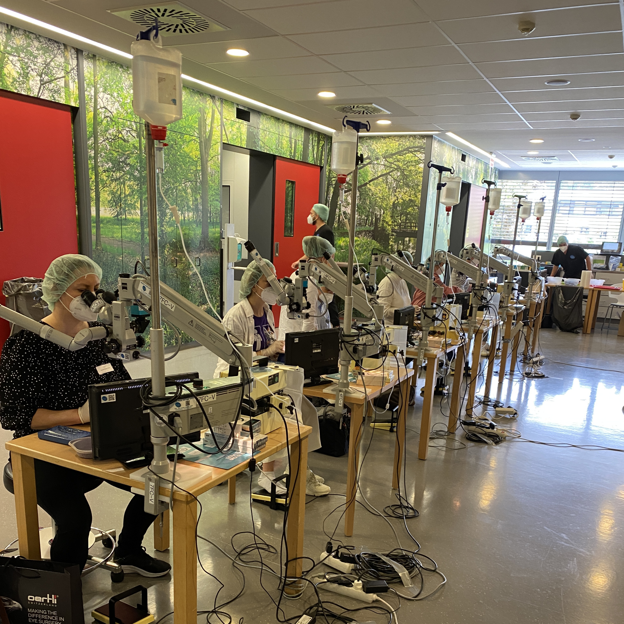 Am 13. und 14. Mai 2022 fand parallel ein Anfänger- als auch einen Fortgeschrittenen-Phakokurs in der Zusammenarbeit mit den Firmen Oertli und Kowa im Augen-Zentrum-Nordwest statt. Die Teilnehmerinnen konnten in der Augenklinik vom Augen-Zentrum-Nordwest auch unter real life Bedingungen am Mikroskop neben der Theorie praktische Kenntnisse erlangen bzw. vertiefen. Sie lobten die vielen Arbeitsplätze, an denen sie von den Augenchirurginnen Dr. Stefanie Schmickler (Augen-Zentrum-Nordwest, Ahaus), Dr. Catharina Latz (Klinik Dardenne), Dr. Nicola Vandemeulebroecke (Marien Hospital Düsseldorf) und Dr. Ann Barelmann, Dr. Melissa Meyer zu Hörste und Dr. Monika Fröhlich (Augen-Zentrum-Nordwest) angeleitet wurden. Eine Teilnehmerin fasste es im Anschluss an die Adresse des Vereins der Augenchirurginnen e.V. so zusammen: