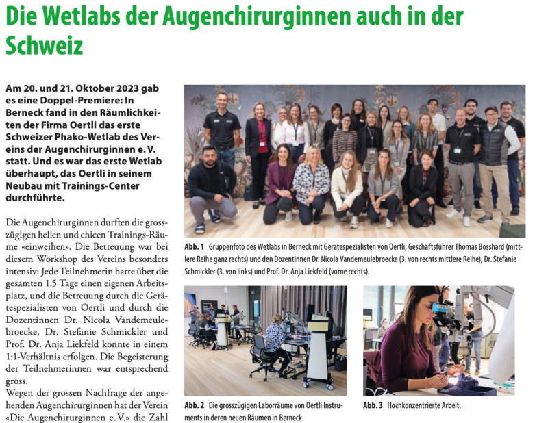 Am 20. und 21. Oktober 2023 gab es eine Doppel-Premiere: In Berneck fand in den Räumlichkeiten der Firma Oertli das erste Schweizer Phako-Wetlab des Vereins der Augenchirurginnen e. V. statt. Und es war das erste Wetlab überhaupt, das Oertli in seinem Neubau mit Trainings-Center durchführte.