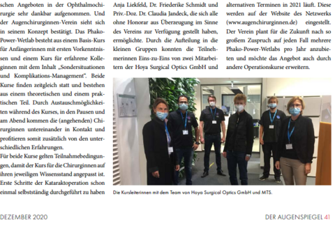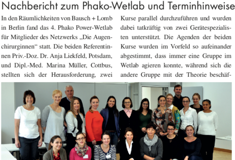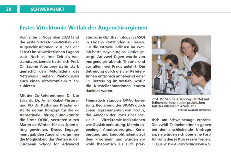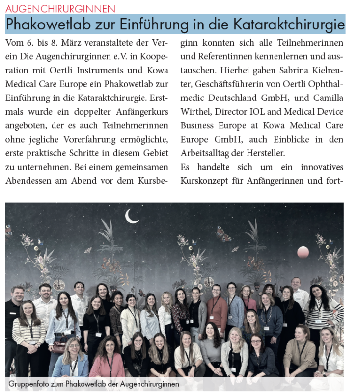 Vom 6. bis 8. März veranstaltete der Verein Die Augenchirurginnen e.V. in Kooperation mit Oertli Instruments und Kowa Medical Care Europe ein Phakowetlab zur Einführung in die Kataraktchirurgie. Erstmals wurde ein doppelter Anfängerkurs angeboten, der es auch Teilnehmerinnen ohne jegliche Vorerfahrung ermöglichte, erste praktische Schritte in diesem Gebiet zu unternehmen. Bei einem gemeinsamen Abendessen am Abend vor dem Kursbeginn konnten sich alle Teilnehmerinnen und Referentinnen kennenlernen und austauschen. Hierbei gaben Sabrina Kielreuter, Geschäftsführerin von Oertli Ophthalmedic Deutschland GmbH, und Camilla Wirthel, Director IOL and Medical Device Business Europe at Kowa Medical Care Europe GmbH, auch Einblicke in den Arbeitsalltag der Hersteller. Es handelte sich um ein innovatives Kurskonzept für Anfängerinnen und fortgeschrittene Anfängerinnen...