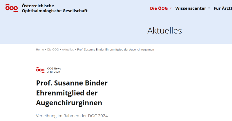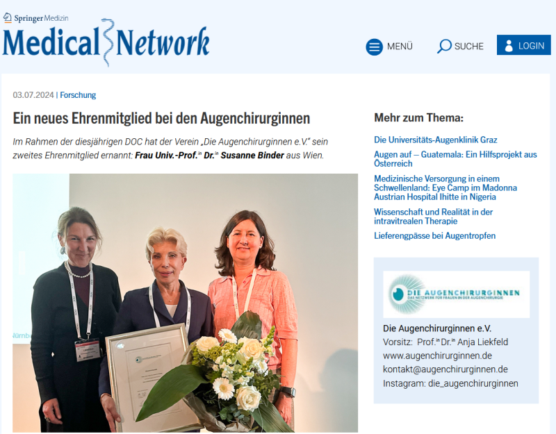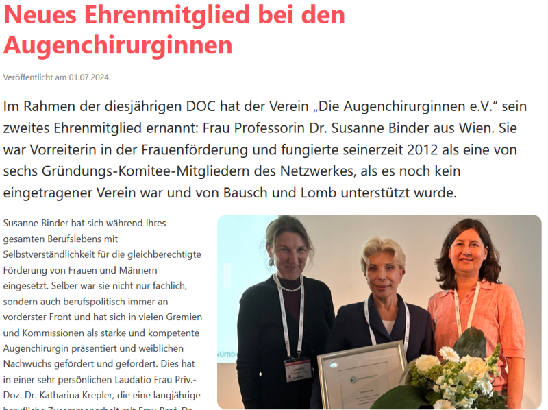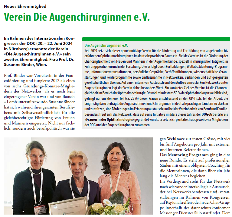 Im Rahmen des Internationalen Kongresses der DOC (20. – 22. Juni 2024 in Nürnberg) ernannte der Verein «Die Augenchirurginnen e. V.» sein zweites Ehrenmitglied: Frau Prof. Dr. Susanne Binder, Wien.
