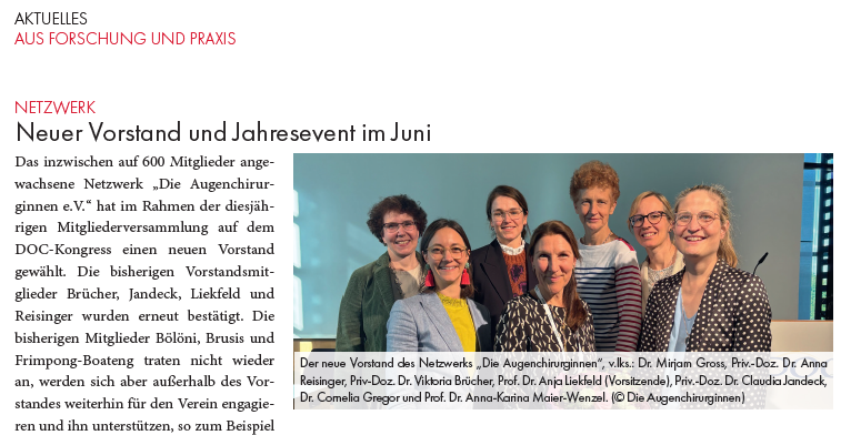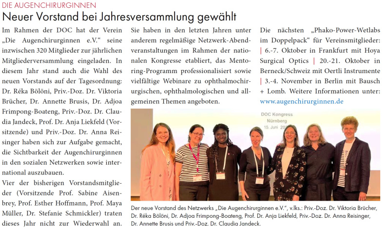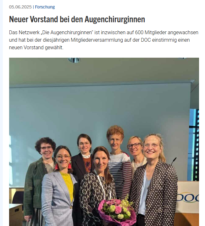 An der Mitgliederversammlung 2025 anlässlich der DOC Nürnberg hat das inzwischen auf 600 Mitglieder angewachsene Netzwerk «Die Augenchirurginnen» einstimmig einen neuen Vorstand gewählt. Die bisherigen Vorstandsmitglieder Brücher, Jandeck, Liekfeld und Reisinger wurden bestätigt. Die bisherigen Mitglieder Bölöni, Brusis und Frimpong-Boateng traten nicht wieder an. Ihnen wurde für ihre engagierte Arbeit im Vorstand gedankt.