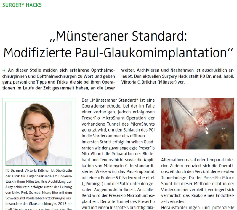 An dieser Stelle melden sich erfahrene Ophthalmochirurginnen und Ophthalmochirurgen zu Wort und geben ganz persönliche Tipps und Tricks, die sie bei ihren Operationen im Laufe der Zeit gesammelt haben, an die Leser weiter. Archivieren und Nachahmen ist ausdrücklich erlaubt. Den aktuellen Surgery Hack stellt PD Dr. med. habil. Viktoria C. Brücher (Münster) vor.