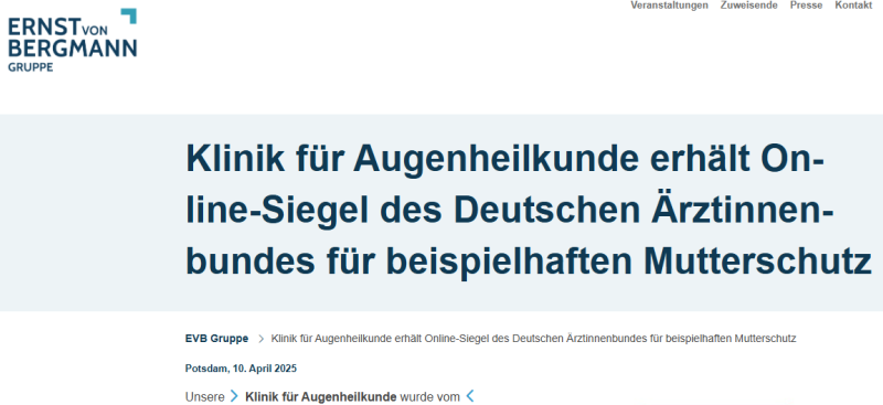 Unsere Klinik für Augenheilkunde wurde vom Deutschen Ärztinnenbund e.V. (DÄB) mit dem Online-Siegel ausgezeichnet, das für die vorbildliche Umsetzung des Mutterschutzes steht. Damit wird die Klinik als Positivbeispiel hervorgehoben, das schwangeren Ärztinnen ermöglicht, ihre Arbeit ohne berufliche Nachteile fortzusetzen.
