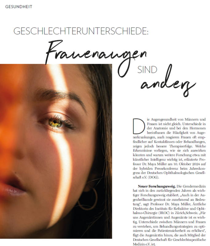 Die Augengesundheit von Männern und Frauen ist nicht gleich. Unterschiede in der Anatomie und bei den Hormonen beeinflussen die Häufigkeit von Augenerkrankungen, auch reagieren Frauen oft empfindlicher auf Kontaktlinsen oder Behandlungen, zeigen jedoch bessere Therapieerfolge. Welche Erkenntnisse vorliegen, wie sie sich auswirken könnten und warum weitere Forschung etwa mit künstlicher Intelligenz wichtig ist, erläuterte Professor Dr. Maya Müller am 10. Oktober 2024 auf der hybriden Pressekonferenz beim Jahreskongress der Deutschen Ophthalmologischen Gesellschaft e.V. (DOG).