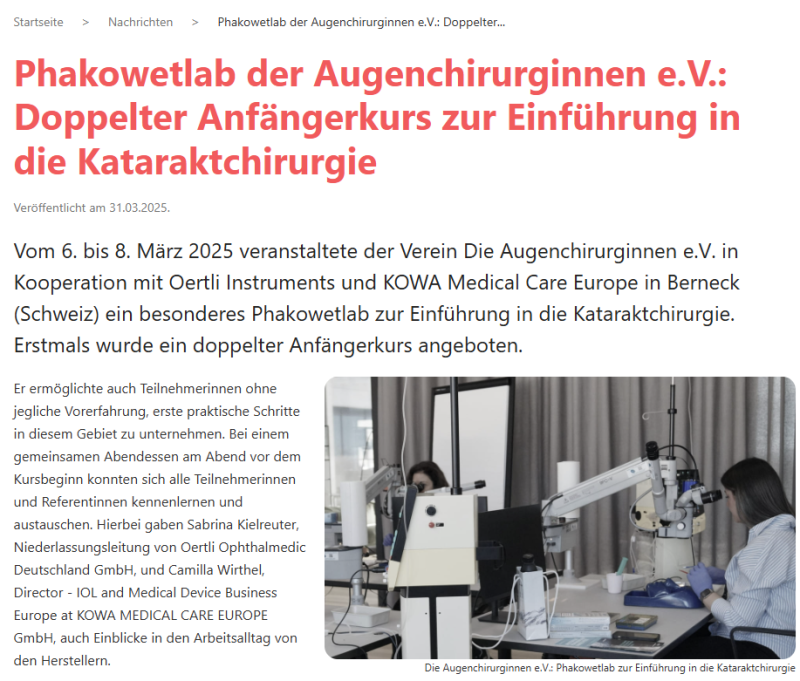 Vom 6. bis 8. März 2025 veranstaltete der Verein Die Augenchirurginnen e.V. in Kooperation mit Oertli Instruments und KOWA Medical Care Europe in Berneck (Schweiz) ein besonderes Phakowetlab zur Einführung in die Kataraktchirurgie. Erstmals wurde ein doppelter Anfängerkurs angeboten.