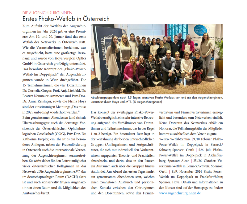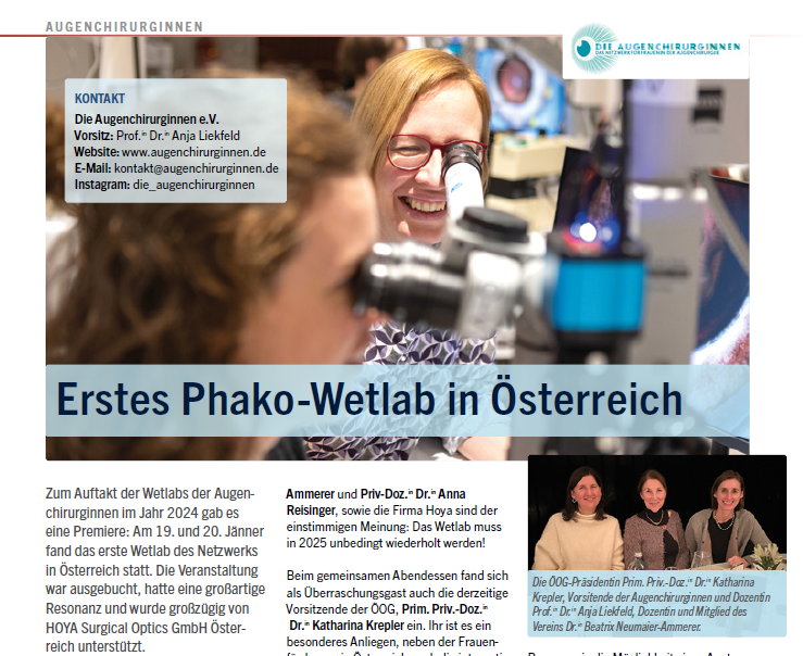Zum Auftakt der Wetlabs der Augenchirurginnen im Jahr 2024 gab es eine Premiere: Am 19. und 20. Jänner fand das erste Wetlab des Netzwerks in Österreich statt. Die Veranstaltung war ausgebucht, hatte eine großartige Resonanz und wurde großzügig von HOYA Surgical Optics GmbH Österreich unterstützt.