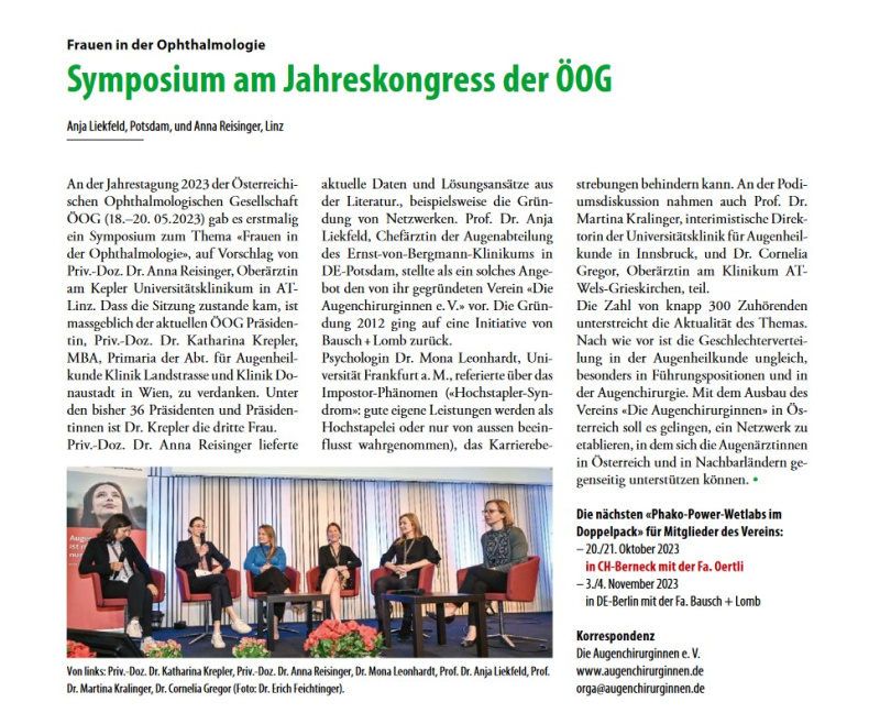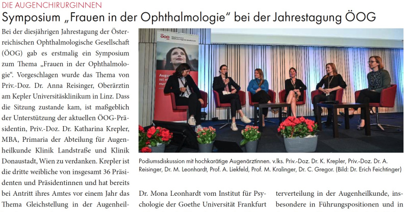 An der Jahrestagung 2023 der Österreichischen Ophthalmologischen Gesellschaft ÖOG (18. - 20-05-2023) gab es erstmalig ein Symposium zum Thema "Frauen in der Ophthalmologie auf Vorschlag von Priv.-Doz. Dr. Anna Reisinger, Oberärztin am Kepeler Universitätsklinikum in AT-Linz.
