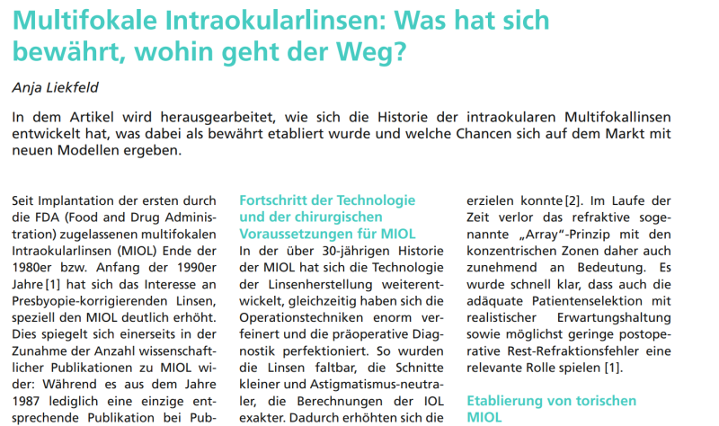 In dem Artikel wird herausgearbeitet, wie sich die Historie der intraokularen Multifokallinsen entwickelt hat, was dabei als bewährt etabliert wurde und welche Chancen sich auf dem Markt mit neuen Modellen ergeben.