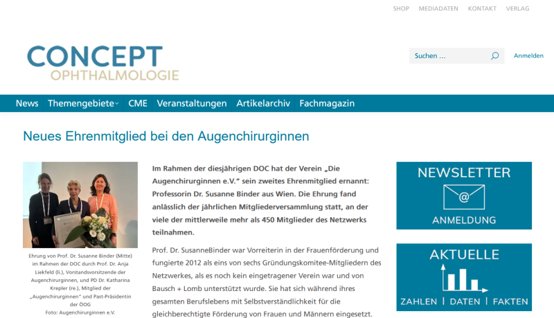 Im Rahmen der diesjährigen DOC hat der Verein „Die Augenchirurginnen e.V.“ sein zweites Ehrenmitglied ernannt: Frau Univ.-Prof. Dr. Susanne Binder aus Wien.