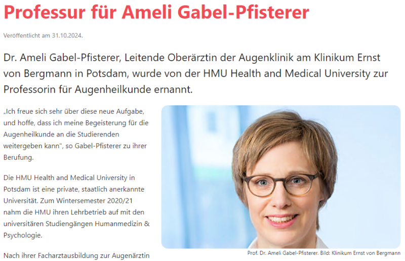 Dr. Ameli Gabel-Pfisterer, Leitende Oberärztin der Augenklinik am Klinikum Ernst von Bergmann in Potsdam, wurde von der HMU Health and Medical University zur Professorin für Augenheilkunde ernannt.