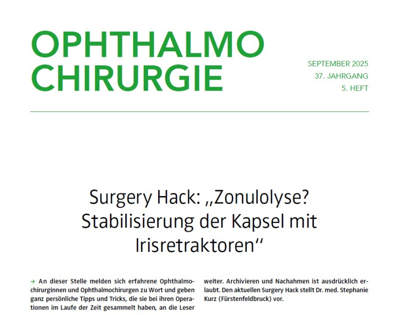 An dieser Stelle melden sich erfahrene Ophthalmochirurginnen und Ophthalmochirurgen zu Wort und geben ganz persönliche Tipps und Tricks, die sie bei ihren Operationen im Laufe der Zeit gesammelt haben, an die Leser weiter. Archivieren und Nachahmen ist ausdrücklich erlaubt. Den aktuellen Surgery Hack stellt Dr. med. Stephanie Kurz (Fürstenfeldbruck) vor.