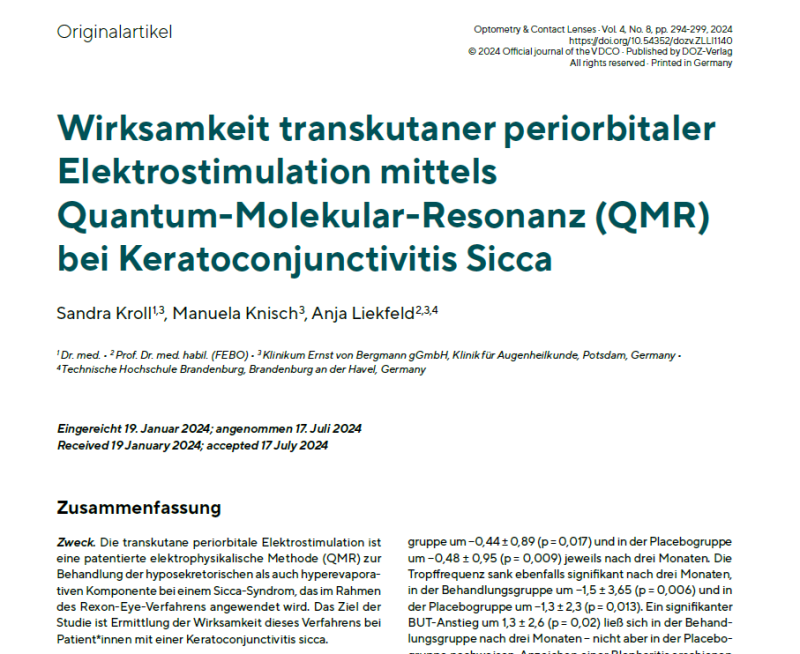 Zweck. Die transkutane periorbitale Elektrostimulation ist eine patentierte elektrophysikalische Methode (QMR) zur Behandlung der hyposekretorischen als auch hyperevaporativen Komponente bei einem Sicca-Syndrom, das im Rahmen des Rexon-Eye-Verfahrens angewendet wird. Das Ziel der Studie ist Ermittlung der Wirksamkeit dieses Verfahrens bei Patient*innen mit einer Keratoconjunctivitis sicca.