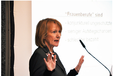 Prof. Funken analysierte auf Basis der von ihr fortlaufend durchgeführten Studien die geschlechterspezifischen Unterschiede mit Blick auf die Struktur, die Kultur, das Klima, die Mikropolitik und die Haltungen in der unternehmenswirtschaftlichen Arbeitswelt.