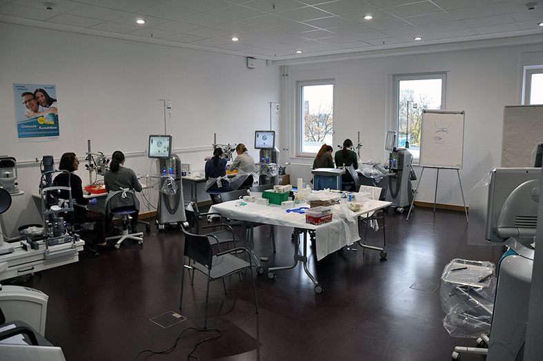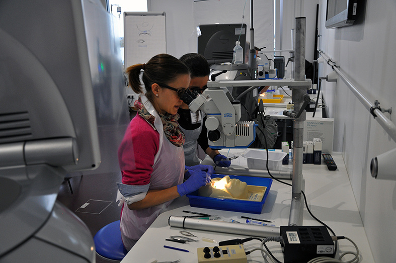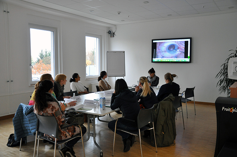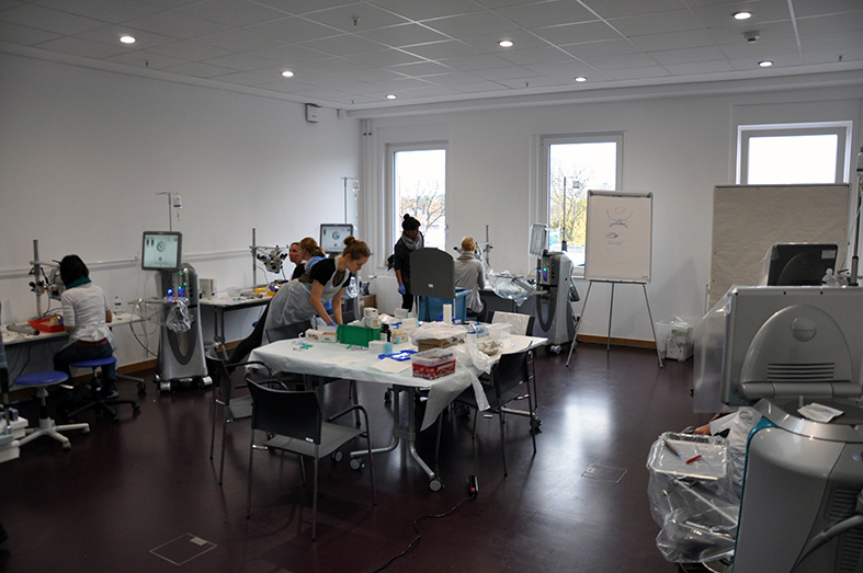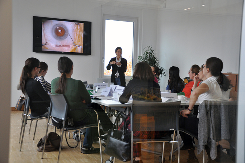 Der Basis-Kurs (Kurs 1) richtete sich an Netzwerk-Mitglieder mit ersten operativen Erfahrungen und bot den zehn Kursteilnehmerinnen die Gelegenheit, einerseits die Schritte der Kataraktoperation an Schweineaugen zu üben und andererseits anhand von anschaulichen Präsentationen und OP-Videos fundierte Informationen von den beiden Referentinnen zu erhalten.