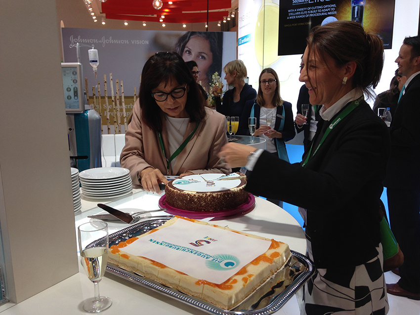 Im Anschluss an diese einstimmenden Worte schritten die beiden Gründungskomitee-Mitglieder, Frau Priv.-Doz. Anja Liekfeld und Frau Dipl.-Med. Marina Müller, „zur Tat“, schnitten die beiden gelungenen „Geburtstagstorten“ an und stießen mit allen Anwesenden auf die vergangenen 5 Jahre des effektiven Dialogs zugunsten aller Mitglieder und letztendlich aller Frauen in der Augenchirurgie an.